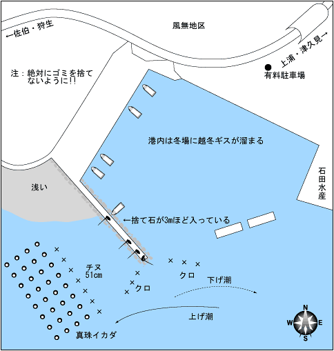 夏から秋に掛けては良型のアジやヤズも回遊してくる。マキエはアミエビを多く入れたものがよい。