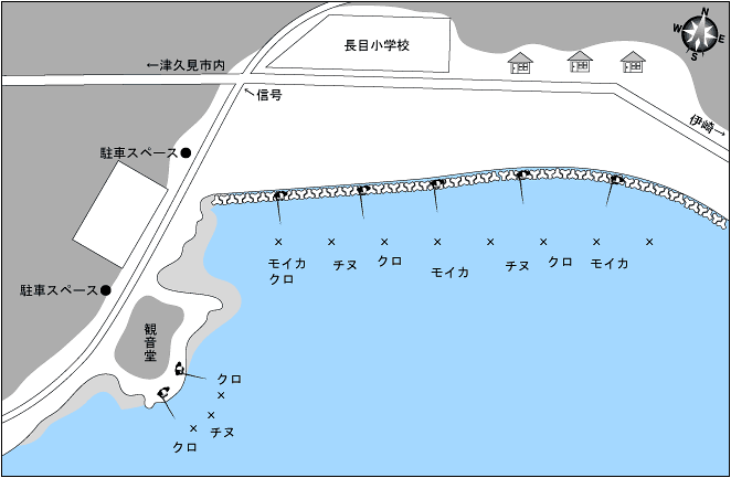ベラ、メバルなどのエサ盗りが多いので遠投するなどして対応するとよい。水深5〜7mくらい。 西側の地磯でも、同様の釣果が期待できるのでお勧めしたい。