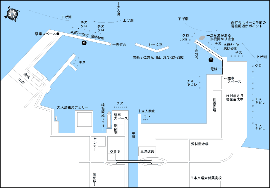 大入島との水道に面するこの港は、天候に左右されにくくチヌの魚影が大変濃いため人気が高い。チヌは一年を通じて狙えるが、4〜5月の乗っ込み期には50cmオーバーも顔を覗かせる。近くに番匠川の河口があるため11〜4月にかけての雨の後は食いが渋くなる。
