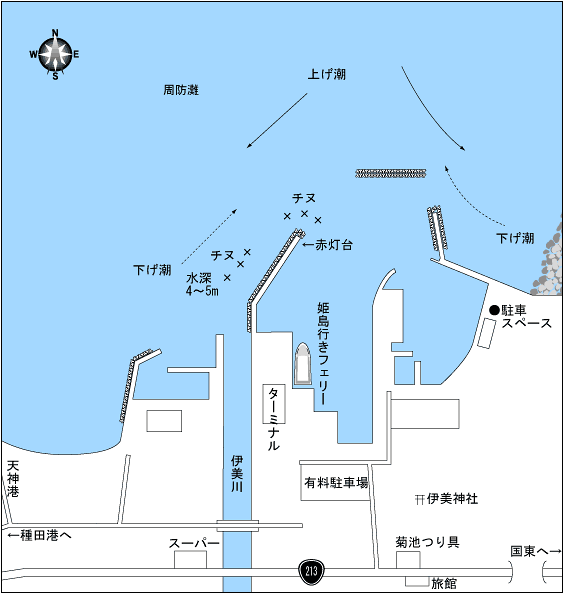 30〜50cmクラスのチヌ、メイタが狙えて実績、人気ともに高く、国東一帯の釣場の中でも特に潮流が速い釣場として知られる。そのため潮止まり前後が釣りやすく、釣果もこの時に集中する傾向にあるので時合いと呼べるだろう。