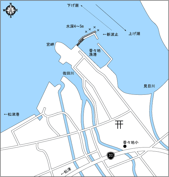沿岸の国道213号から少年自然の家の看板で曲がり、直進すれば突き当たりが釣場なので交通アクセスが容易で、5〜11月までチヌ、メイタ、梅雨時期と10〜12月は足の裏サイズのクロも狙えるので面白い。