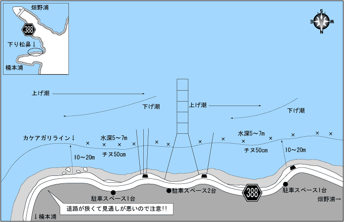道路脇の浜で50cm前後のチヌが釣れるとあって乗っ込みシーズンに人気が高いポイント。波打ち際から10〜20m程沖にある藻場の先のカケアガリがポイントになる。