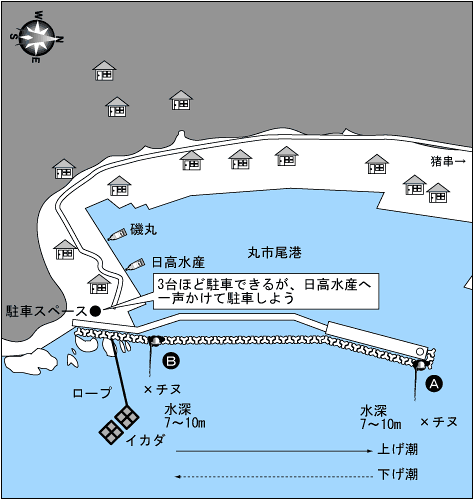 クロは手のひら〜足の裏サイズを中心に狙えるが、チヌは50cm級の大型も期待できる好釣場だ。チヌ・メイタは年中狙うことができ、A、Bのポイントで大チヌの実績が高い。タナはサオ1本半〜2本ほどで、ツケエが底を這うようにするとよいだろう。また、意外と知られていないが夏の夜釣りでは、キビナゴをツケエに使うとフエフキダイが掛かることがある。この時のハリスは3〜4号を使った方が良い。