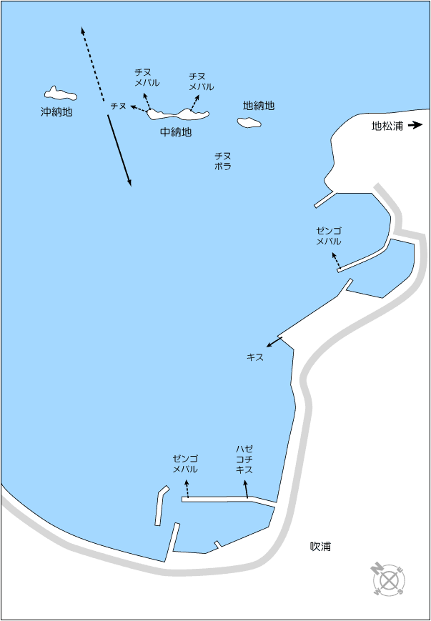 佐伯市街から番匠川を越えて、茶屋ヶ鼻橋から左手の海沿いを進む。この周辺の小さな漁港は夏場はすべてゼンゴのポイントになるが、吹浦の波止からは投げ釣りでキスとコチが狙えるほかメバルも喰ってくる。