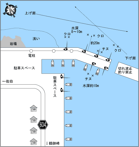 ここ羽出浦の波止も大型のクロが狙える釣場の1つで、やはり梅雨時期から秋口にかけてが1番の狙い目となる。本命は左に流れる下げ潮で実績が高く、朝・夕のまづめ時には40cmオーバーのクロが有望となるポイントだ。