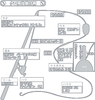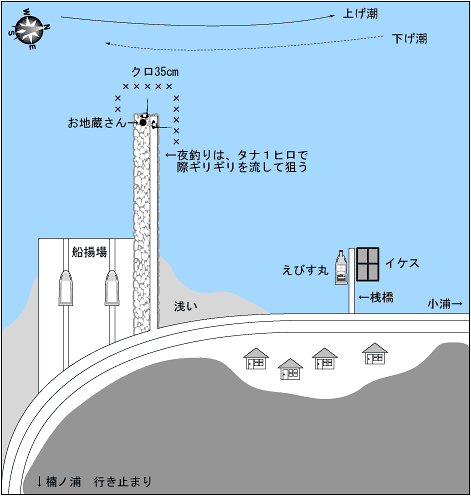 波止先端周りでは、真夏の夜釣りでゴカイをエサに30〜35cmのクロが数釣れる。過去に3人で大型イグロー一杯釣れた事もあるほど。タナは1ヒロ、電気ウキはB程度の浮力で、軽めの仕掛けで波止際ぎりぎりを静かに釣る。マキエは不要。満潮前後に実績が高い。