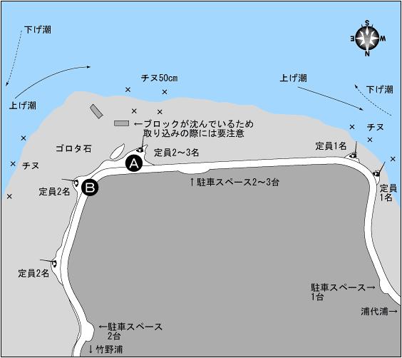 米水津湾の北岸に位置する竹野浦は北西の季節風に比較的強く、2〜4月の間乗っ込みチヌが狙える。盛期である3月下旬には50cmオーバーのチヌが続出する人気ポイント。