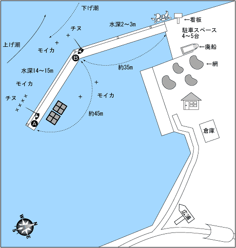 冬場は背側から風を受けるので比較的釣りやすいポイント。中でもB地点がベストポイントとなり、良型チヌ、アジのほかマダイの実績も高い。