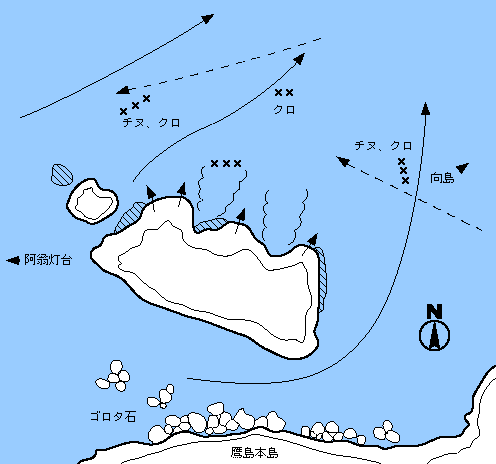 低い独立瀬で特に冬にはなかなか上礁できないが、この周辺ではトップクラスの釣場である。半遊動又は全遊動仕掛けでマキエと同調させながら釣ると、やや沖目でチヌ、クロとも良型が釣れる。とりわけクロの数は周辺ではNO1で、中型でクーラーいっぱいという釣り人も時折見かける。