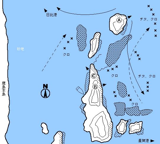 いくつもの岩礁が点在する釣場で日比水道にある近場のため、敬遠する人が多いが、クロ、チヌ、メバルなどの魚影はなかなか捨て難いものがある。A点のハナレからはクロがよく、晩秋には中型のクラスが竿を曲げる。B、C点は沈みの回りを丹念に攻める。仕掛けは固定フカセで1ヒロ半もとればよい。沖目は下げ潮狙いでチヌがよい。春先のメバルもおもしろい。