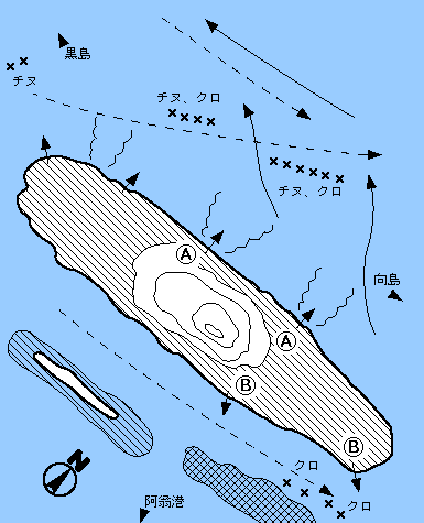 低い瀬なので波に弱いが、比較的深く、潮通しも良いのでチヌ、クロとも数釣りできる。A点はチヌ、クロとも両潮やれる。チヌの2キロ級も春にはできるので竿1本強のタナで狙いたい。B点は下げ潮が通すと正面の沈みまわりで中型のクロが入れ喰いになる時もあるので見逃せない。