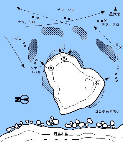 チヌの穴場で乗っ込みチヌは大型で定評がある。ただし大潮時は1日中釣れない低い瀬なので潮をみて瀬替りする。B点が実釣では一番。A点は中小型のクロが下げ潮であたる。C点も下げ狙いでチヌ、クロが釣れる。春のメバルも大型が釣れる。