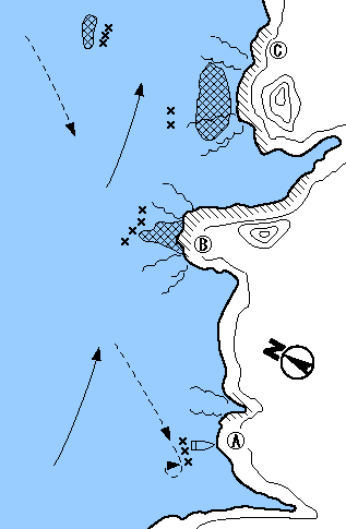 松島中学校の下にあるためこう呼ばれるポイントでチヌに関してはA級の釣場である。Aは上げ潮でクロがよく、下げではチヌがよい。乗っ込み期は2ケタ釣りも可能で、いづれも足元のサラシから沖をねらう。Bは足元の沈みの際をねらい、チヌ、クロともに釣れる。Cは上げ潮で20mぐらい沖にある沈み周辺まで流すと、中型クロが釣れる。