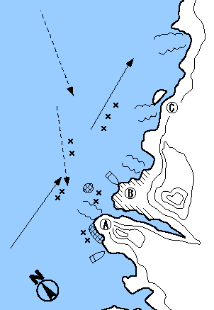 別名マタワダと呼ばれるこのポイントは上げ潮にチヌが釣れる。竿1本〜1本半。クロは足元のサラシにマキエをして、やや沖目をねらう。B点では前方の沈み周辺を丹念に探ると、中型クロが釣れる。C点もクロがよく、上げ潮が走ると、おもしろい。