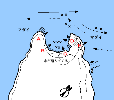 A,Eではカゴ釣りで夜釣りのマダイがおもしろい。型は1〜2キロ級。イサキもあたる。クロはE,Dがよく対馬瀬方向からの下げ潮が磯をかすめて左手方向へ流れる時がよい。ウキ下3ヒロ前後で足の裏クラスが数釣れる。