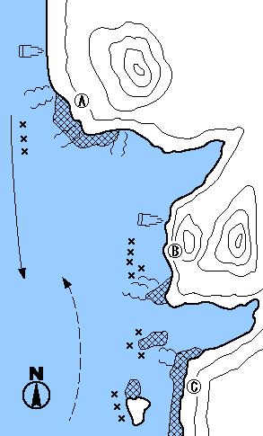 加唐島との水道に面し、潮はよく通す瀬である。Aは足元から深く竿3本ほどの水深がある。前面のテラスの周辺をさぐると中型クロの数釣りができる。ワンド側ではチヌがいい。B点も沈みの前をねらいクロ、やや深くしてチヌがでる。C点はテラスの張り出しが大きく、やや取り込みに苦労するが、下げ潮が動くと、チヌ、クロとも活性が高まる。寒い時期は水深があるので、チヌ、クロとも深くさぐるとよい。