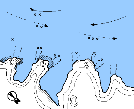 Aは下げ潮がよく、クロは夏は1ヒロ半、冬は3ヒロを