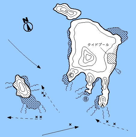 このポイントはクロよりもチヌで有名なポイント。A,Cがねらいのポイントでチヌは3ヒロぐらいのタナで沈み瀬周辺をねらう。Aは両潮やれ、Cは下げに分がる。Bは予備的ポイント。クロは2ヒロのタナで沈み周辺に居着くクロをマキエで浮かせるとよい。