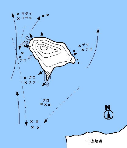 島の西側に浮かぶ独立礁で地磯が多い加唐島ではひときわ目立つ磯である。多少の風でも上礁可能で高場もあり、収容力も大きい。A点はクロの中型の数釣りがよい。チヌもでる。