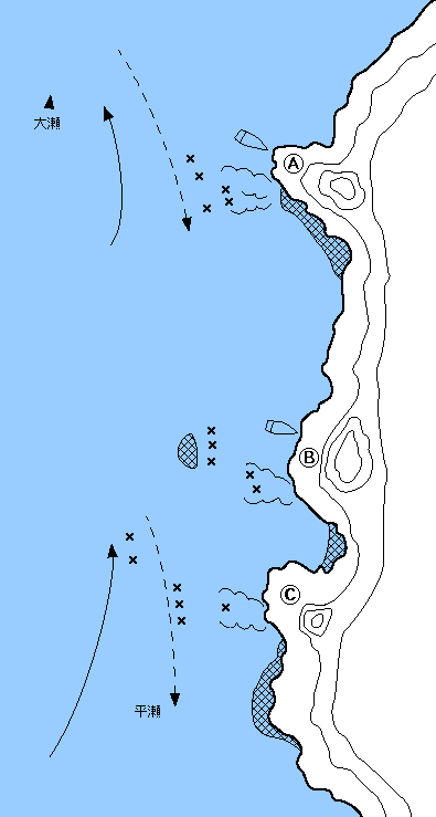 ここは足場もよく、釣り座も広いので10人ぐらいは展開できる。Aは下げ狙いで中型クロの数釣りがよい。大潮がよい。Bも中型クロとキロクラスのチヌが出る。沖に沈み瀬があるので、遠投して少し深めに攻めるとよい結果につながる。Cは両潮やれ、ここもチヌクロがよい。秋からは青物も回遊してくるところで、ヤズ、サバ、アジとおみやげに恵まれことも多い。ベテランはカゴ遠投で夜釣りをかけ、イサキの大型や大マダイの一発にかけるところでもある。