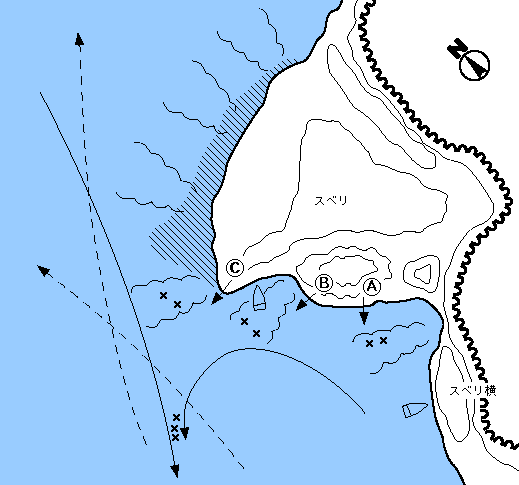 クロは1キロまでだが、数釣りも可能。A,Bともサラシを上手に攻略する。全般に釣りやすい釣り場である。水深もあるので、イサキやマダイの夜釣りもおもしろい。青物の回遊も時々見られる。チヌも大型こそ出ないが、足元でけっこう釣れるポイントである。凪の場合はC点からもねらえる。沖目を竿1本までのタナでねらうと、中型クロが湧く日もあり、ツケエとマキエをうまく同調させること。