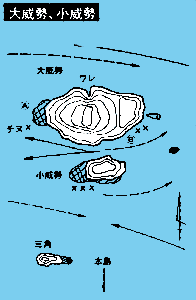 沖側を大威勢、内側を小威勢と呼んでいる。中央部ワレでは過去底物の釣果も聞かれたが、現在ではA、Bのポイントで上物釣りが一般的。Aは上げ潮のポイントでカケ上がりをねらってチヌがよい。Bは小威勢との水道からでる下潮をねらう。足元でクロがよく、タナは竿1本まで。小威勢はクロの良型が釣れる。徹底的に瀬際をねらい、2〜3ヒロのタナで40cmオーバーも期待できる。