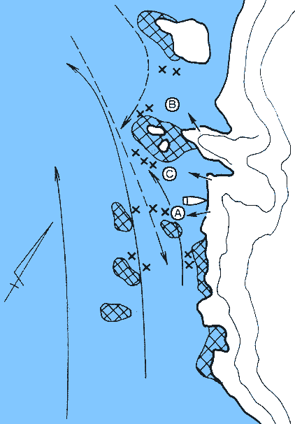 Aは左前方の沈み周辺をねらう。タナ竿一本半でチヌ。Bは下げ潮で小型のクロ。Cは逆に上げ潮をねらう。
