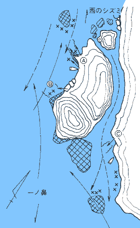 春チヌの特級ポイントでAは下げ潮では瀬際でクロがよい。上げ潮では沖の沈み周辺が春チヌの特級ポイント。竿1本と1ヒロのタナ。マダイや青物の一発大物もねらえる。Bは下げ潮の瀬際でクロ。風の強い日はCのポイントで下げ潮にクロとチヌが釣れる。