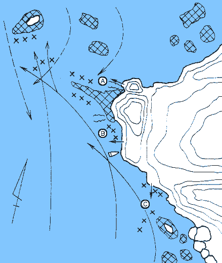 Aのポイントは張り出した根際で中小型クロ、沖のハナレの手前でチヌがよい。タナは7m前後。Bは上げ潮時に竿1本までのタナで瀬際をねらい、チヌ、クロ共によい。Cは予備ポイントだが、北西風が強いとよい釣場になる。