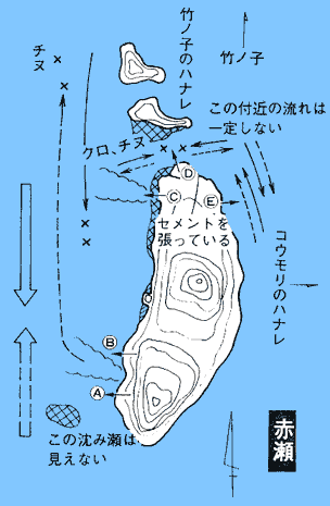 瀬というより島と呼ぶほど大きい。歩いて一周でき、ポイントは自由に変えられる。北東の風にも強く、沖の瀬がだめな時でも竿が出せるところだ。A・Bは足場は違うが、同じサラシを攻める。サラシが下げ本流とぶつかり竹ノ子の沖まで仕掛けを運ぶ時にチヌがでる。クロは足元でも釣れる。Cは上げ潮の沖目狙い。チヌ、クロ共によい。