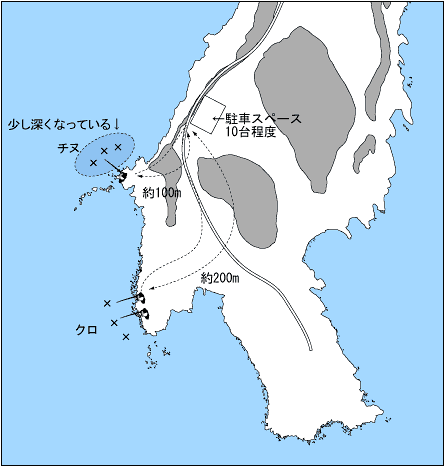 夏場はエサ盗りが多く釣りづらいが、駐車場下の釣場は水深が5〜8mあり好ポイントとなっている。クロ、チヌ共に狙えるが、全体的に浅く根も濃いので遠投して釣った方が良い。