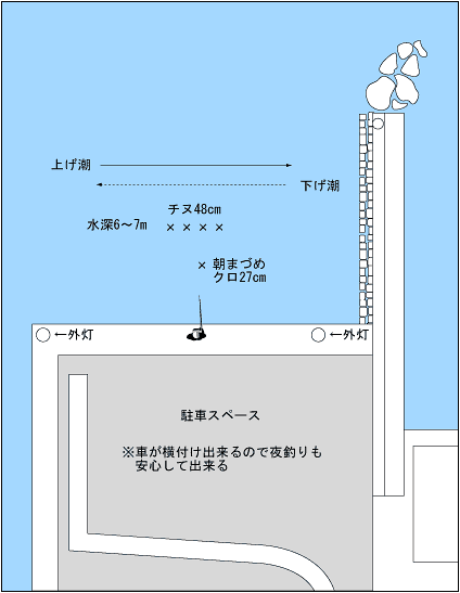 潮が左に流れている時が良く、サオ2本先で水深6〜7m程。ウキ下は底をズラすようにイメージして狙うと良い。クロは朝まづめがよくサオ1本半先から狙い、全遊動仕掛けか、沈め釣りが有効。ツケエはどちらもオキアミがよく、クロ狙いの場合でもオキアミの頭を付けたまま狙っても有効。アオリイカもエギング・泳がせどちらでも釣れる。