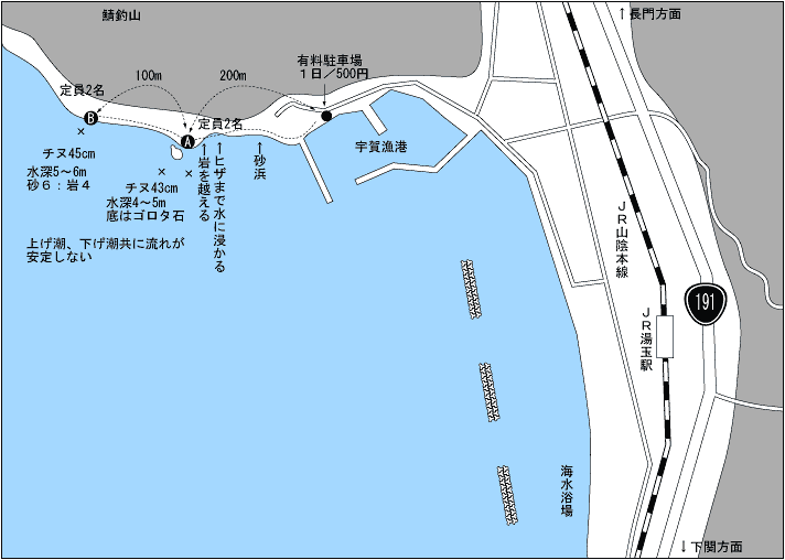 宇賀漁港先から砂浜を歩いて行けるが、途中ヒザまで水に浸かる場所があるので、軽装が望ましい。クロは秋口〜冬にかけてがよく30〜35cmクラスが釣れる。手前にエサ盗りを寄せて、遠投で狙うと良い。